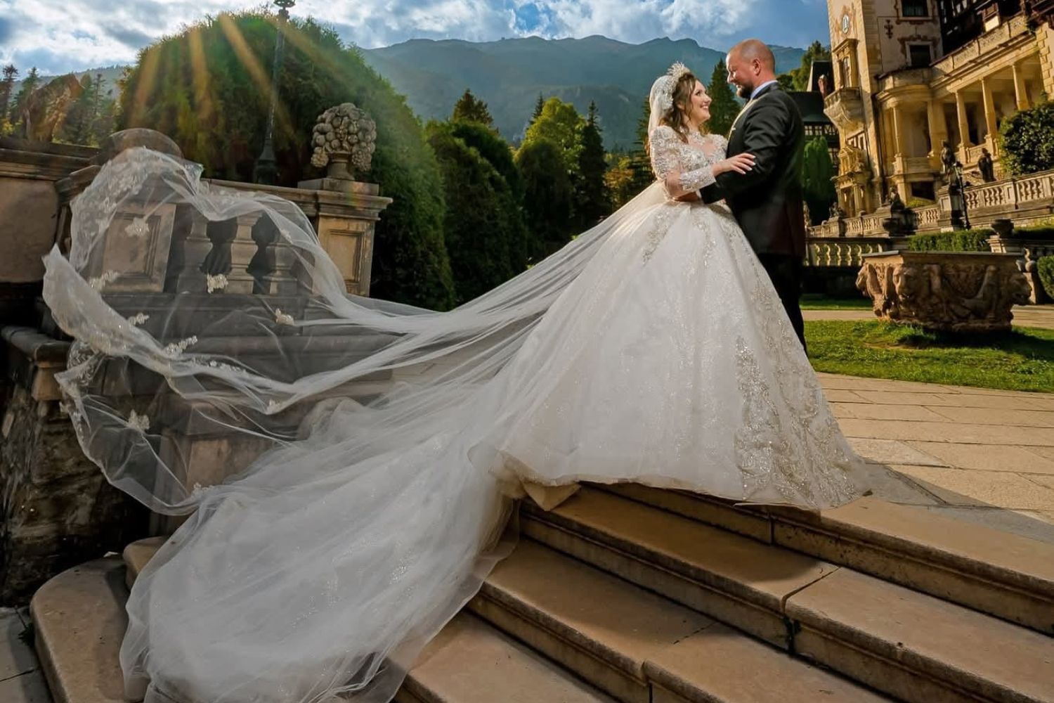 Your accessories are traditional and refined: pearl earrings, a long veil, and an elegant hairstyle.